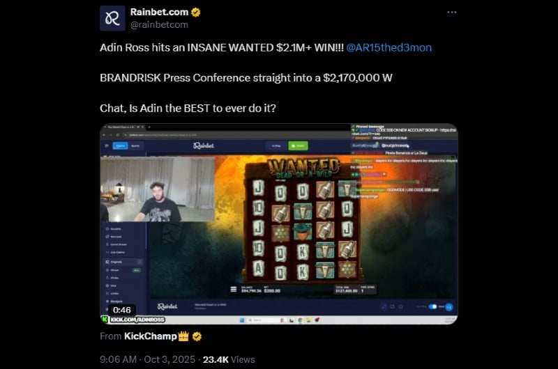Adin Ross Lands $2.17M Jackpot on Wanted Dead or a Wild at Rainbet Casino