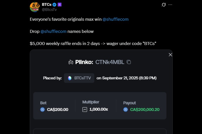 - BTCsTV won $200,000 with a $200 Plinko bet at Shuffle Casino.
